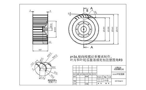 這種風(fēng)機(jī)現(xiàn)有的制造方式,基本都是以鋼板焊接為主,其中,葉輪也有用鉚接的方式制作的;這里主要介紹鋼板制作的,同時(shí)探討有可能注塑的結(jié)構(gòu)。